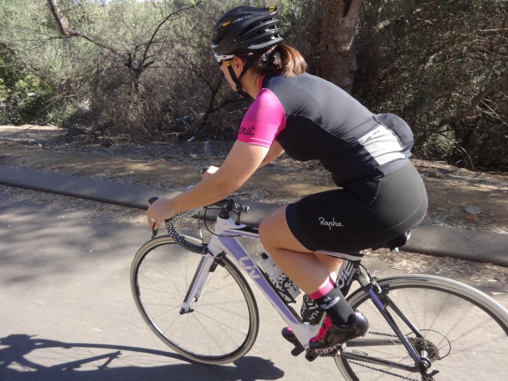 The women’s collection included long sleeve jerseys, short sleeve jerseys and some of the most attractive sleeveless jerseys I’ve seen. They also have bibs, gloves, helmets, socks, and sunglasses. I am test riding the Elite W jersey in black/pink.