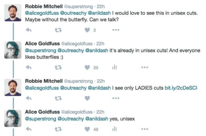 The shirt in question reads “‘LADIES’ IS GENDER NEUTRAL” and is only offered in women’s sizes. However, I presented the women’s sizes as unisex and replied to requests for men’s sizing with phrases women have heard many times.