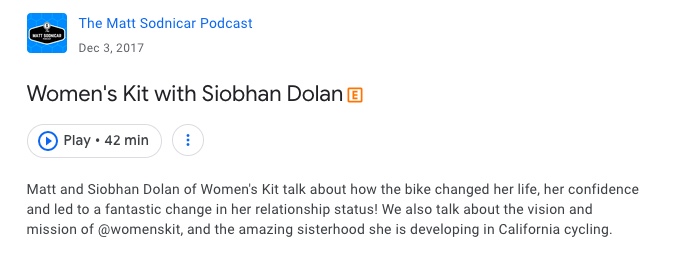 Press Read the CyclingTips interview: https://cyclingtips.com/2016/09/meet-siobhan-dolan-the-woman-behind-the-womenskit-instagram-account/ Read the CyclingTips article: https://cyclingtips.com/2016/11/how-i-learned-to-ride-at-age-30-and-what-it-has-taught-me/ Share this: Click to share on Pinterest (Opens in new window) Pinterest Click to share on Facebook (Opens in new window) Facebook Click to share on X (Opens in new window) X Click to email a link to a friend (Opens in new window) Email Like Loading...
